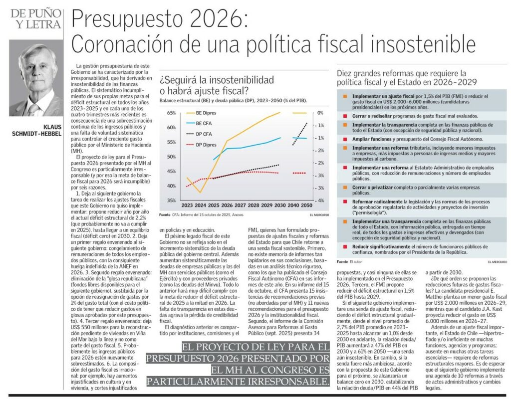 13.11.2025 El Mercurio Columna Klaus Schmidt-Hebbel: «Presupuestos 2026: Coronación de una política fiscal insostenible» JPG 203,9 KB en El Mercurio