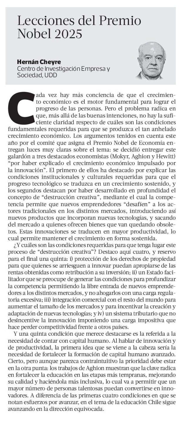 13.11.2025 La Tercera Columna de Hernán Cheyre: «Lecciones del Premio Nobel 2025» JPG 355,1 KB en La Tercera