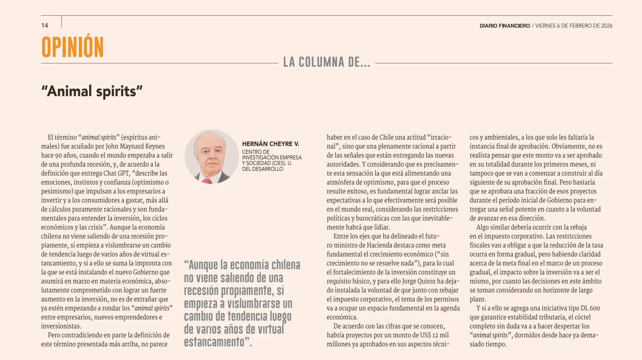 16.02.2026 Diario Financiero Columna de Hernán Cheyre: «Animal spirits» JPG 458,2 KB en Diario Financiero