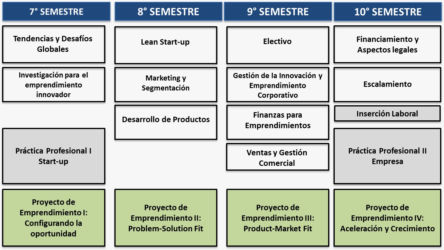 ** Emprendimiento Innovador y Desarrollo Profesional II es prerrequisito y debe estar aprobado antes del inicio del programa.