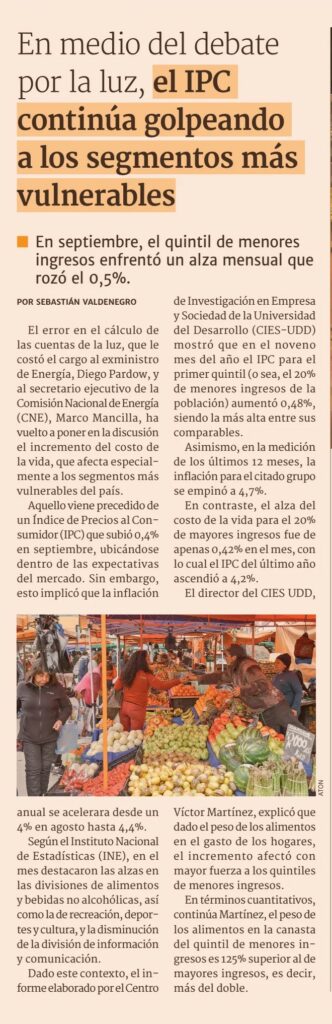 El director del CIES UDD, Víctor Martínez, explicó que dado el peso de los alimentos en el gasto de los hogares, el incremento afectó con mayor fuerza a los quintiles de menores ingresos.