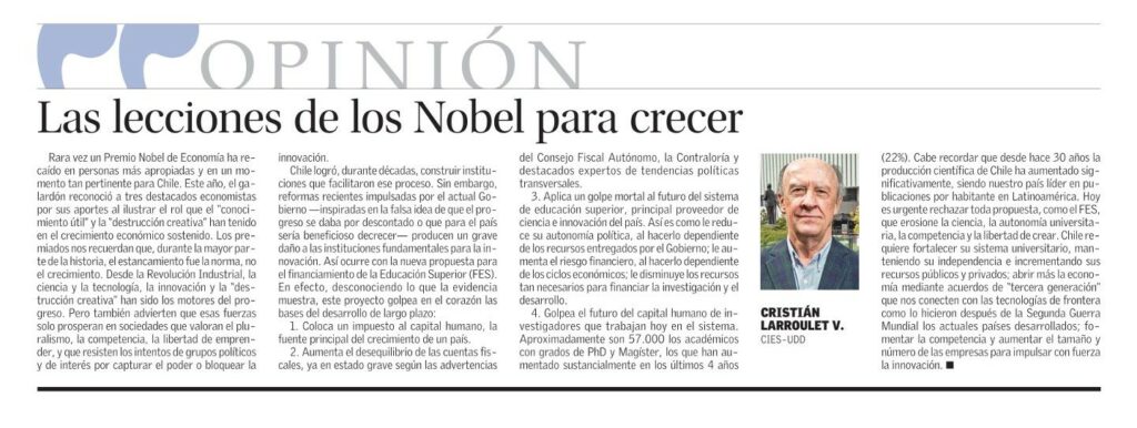Rara vez un Premio Nobel de Economía ha recaído en personas más apropiadas y en un momento tan pertinente para Chile. Este año, el galardón reconoció a tres destacados economistas por sus aportes al ilustrar el rol que el “conocimiento útil» y la «destrucción creativa» han tenido en el crecimiento económico sostenido. Los premiados nos recuerdan que, durante la mayor parte de la historia, el estancamiento fue la norma, no el crecimiento. Desde la Revolución Industrial, la ciencia y la tecnología, la innovación y la «destrucción creativa” han sido los motores del progreso. Pero también advierten que esas fuerzas solo prosperan en sociedades que valoran el pluralismo, la competencia, la libertad de emprender, y que resisten los intentos de grupos políticos y de interés por capturar el poder o bloquear la innovación.
