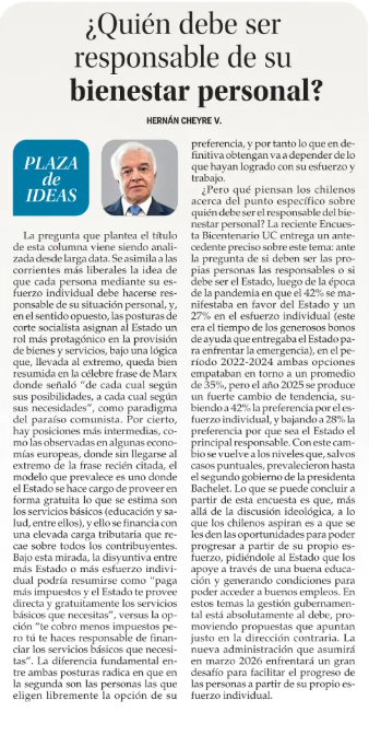 ¿Pero qué piensan los chilenos acerca del punto específico sobre quién debe ser el responsable del bienestar personal? La reciente Encuesta Bicentenario UC entrega un antecedente preciso sobre este tema: ante la pregunta de si deben ser las propias personas las responsables o si debe ser el Estado, luego de la época de la pandemia en que el 42% se manifestaba en favor del Estado y un 27% en el esfuerzo individual (este era el tiempo de los generosos bonos de ayuda que entregaba el Estado para enfrentar la emergencia), en el período 2022-2024 ambas opciones empataban en torno a un promedio de 35%, pero el año 2025 se produce un fuerte cambio de tendencia, subiendo a 42% la preferencia por el esfuerzo individual, y bajando a 28% la preferencia por que sea el Estado el principal responsable.