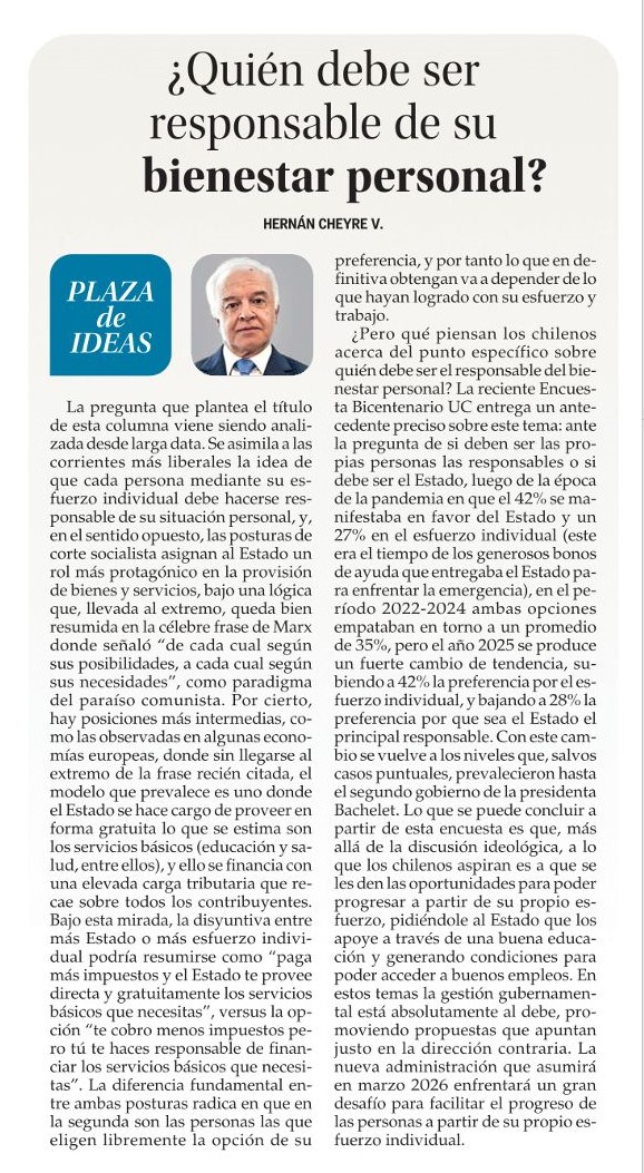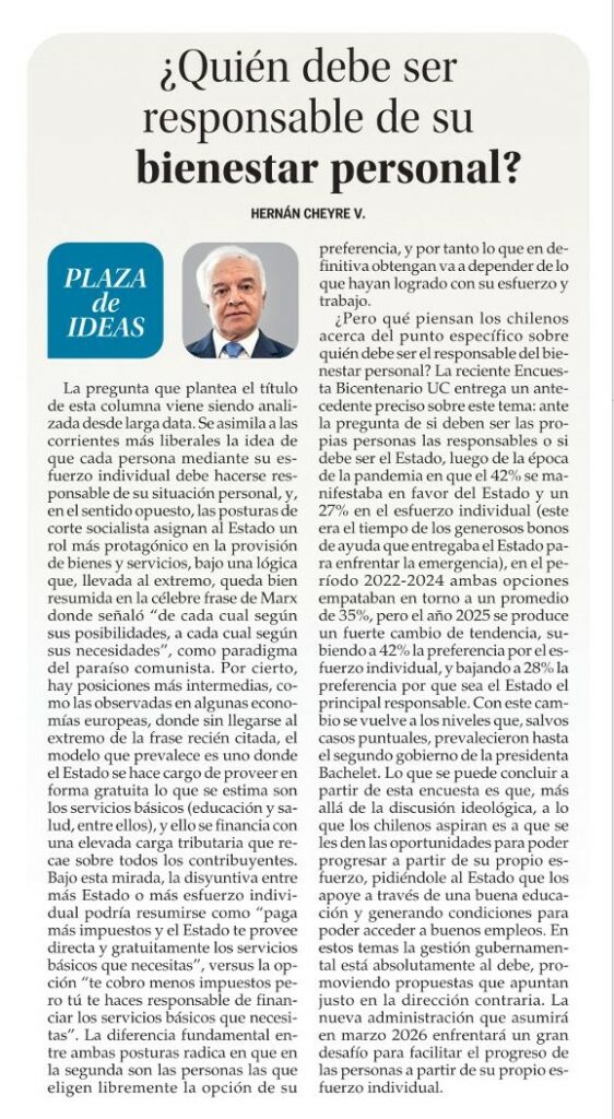 ¿Pero qué piensan los chilenos acerca del punto específico sobre quién debe ser el responsable del bienestar personal? La reciente Encuesta Bicentenario UC entrega un antecedente preciso sobre este tema: ante la pregunta de si deben ser las propias personas las responsables o si debe ser el Estado, luego de la época de la pandemia en que el 42% se manifestaba en favor del Estado y un 27% en el esfuerzo individual (este era el tiempo de los generosos bonos de ayuda que entregaba el Estado para enfrentar la emergencia), en el período 2022-2024 ambas opciones empataban en torno a un promedio de 35%, pero el año 2025 se produce un fuerte cambio de tendencia, subiendo a 42% la preferencia por el esfuerzo individual, y bajando a 28% la preferencia por que sea el Estado el principal responsable.