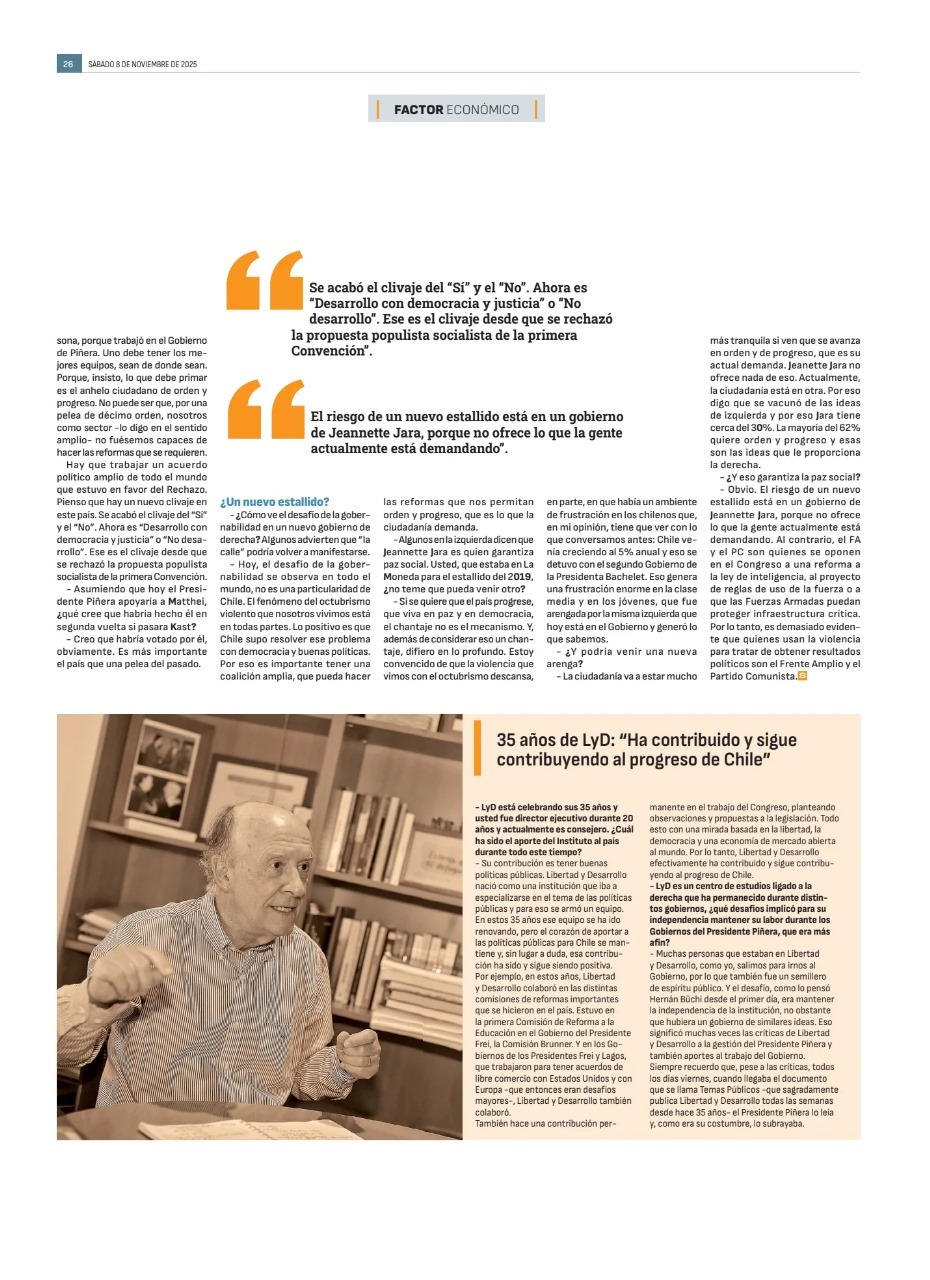 – La ciudadanía va a estar mucho más tranquila si ven que se avanza en orden y de progreso, que es su actual demanda. Jeanette Jara no ofrece nada de eso. Actualmente, la ciudadanía está en otra. Por eso digo que se vacunó de las ideas de izquierda y por eso Jara tiene cerca del 30%. La mayoría del 62% quiere orden y progreso y esas son las ideas que le proporciona la derecha.