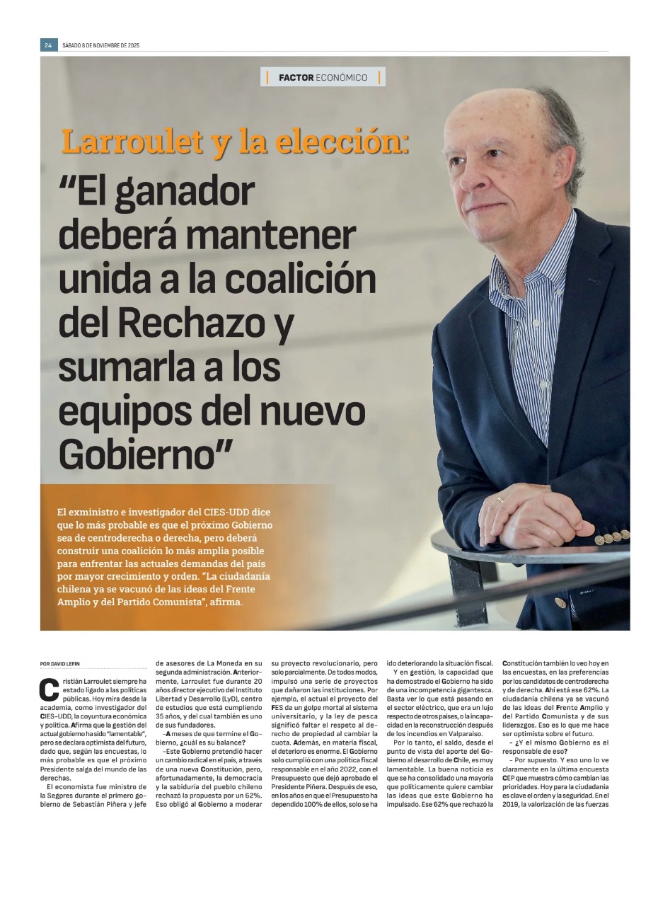 Cristián Larroulet siempre ha estado ligado a las políticas públicas. Hoy mira desde la academia, como investigador del CIES-UDD, la coyuntura económica y política. Afirma que la gestión del actual gobierno ha sido “lamentable”, pero se declara optimista del futuro, dado que, según las encuestas, lo más probable es que el próximo Presidente salga del mundo de las derechas. El economista fue ministro de la Segpres durante el primero gobierno de Sebastián Piñera y jefe de asesores de La Moneda en su segunda administración. Anteriormente, Larroulet fue durante 20 años director ejecutivo del Instituto Libertad y Desarrollo (LyD), centro de estudios que está cumpliendo 35 años, y del cual también es uno de sus fundadores.