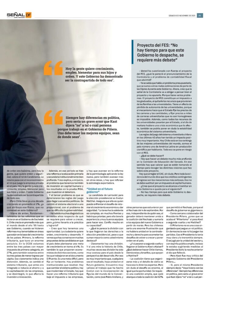 – Creo que hoy tenemos una oportunidad. La ciudadanía quiere orden, crecimiento y desarrollo. Y vemos que hay consenso en muchas propuestas delos candidatos en que el país debe plantearse una meta de crecimiento en torno al 4%. Es también lo que proponen economistas de distintos sectores, como los que trabajaron en el documento El Puente. Es una meta difícil, pero fija un horizonte. Hay problemas institucionales que resolver. Hay que cambiar el sistema político, hay que modernizar el Estado, hay que hacer una reforma tributaria que baje el impuesto a las empresas, y hay que avanzar en la reforma dela permisología aplicando la ley nueva, pero también avanzar más en otras áreas, y hay que reforzar la estrategia exportadora.