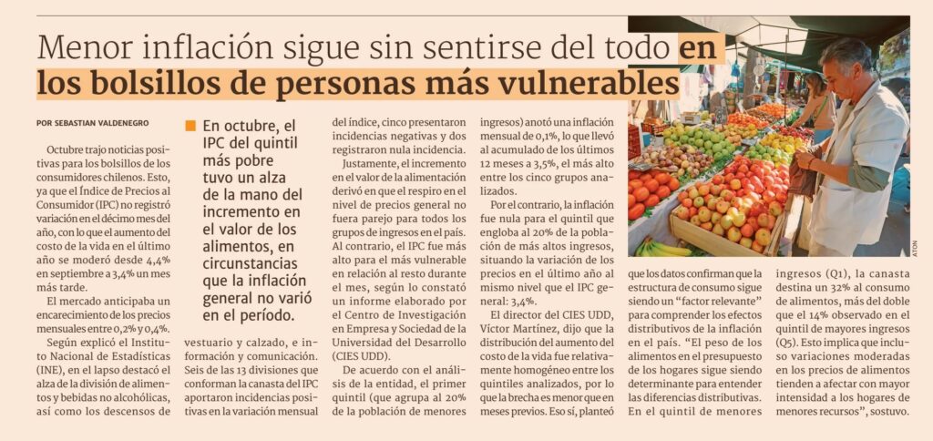 El director del CIES UDD, Víctor Martínez, dijo que la distribución del aumento del costo de la vida fue relativamente homogéneo entre los quintiles analizados, por lo que la brecha es menor que en meses previos. Eso sí, planteó que los datos confirman que la estructura de consumo sigue siendo un “factor relevante” para comprender los efectos distributivos de la inflación en el país. “El peso de los alimentos en el presupuesto de los hogares sigue siendo determinante para entender las diferencias distributivas. En el quintil de menores ingresos (Q1), la canasta destina un 32% al consumo de alimentos, más del doble que el 14% observado en el quintil de mayores ingresos (Q5). Esto implica que incluso variaciones moderadas en los precios de alimentos tienden a afectar con mayor intensidad a los hogares de menores recursos”, sostuvo.