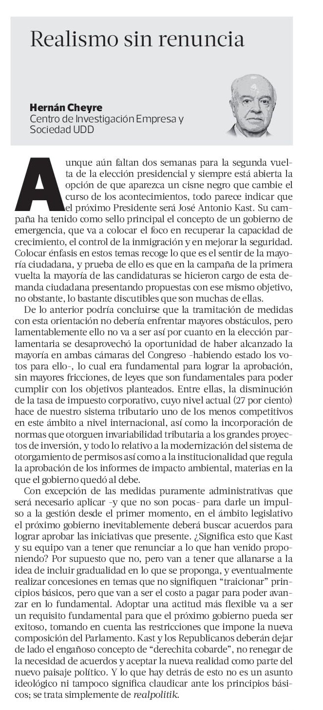 Aunque aún faltan dos semanas para la segunda vuel ta de la elección presidencial y siempre está abierta la opción de que aparezca un cisne negro que cambie el curso de los acontecimientos, todo parece indicar que el próximo Presidente será José Antonio Kast. Su campaña ha tenido como sello principal el concepto de un gobierno de emergencia, que va a colocar el foco en recuperar la capacidad de crecimiento, el control de la inmigración y en mejorar la seguridad. Colocar énfasis en estos temas recoge lo que es el sentir de la mayoría ciudadana, y prueba de ello es que en la campaña de la primera vuelta la mayoría de las candidaturas se hicieron cargo de esta demanda ciudadana presentando propuestas con ese mismo objetivo, no obstante, lo bastante discutibles que son muchas de ellas.