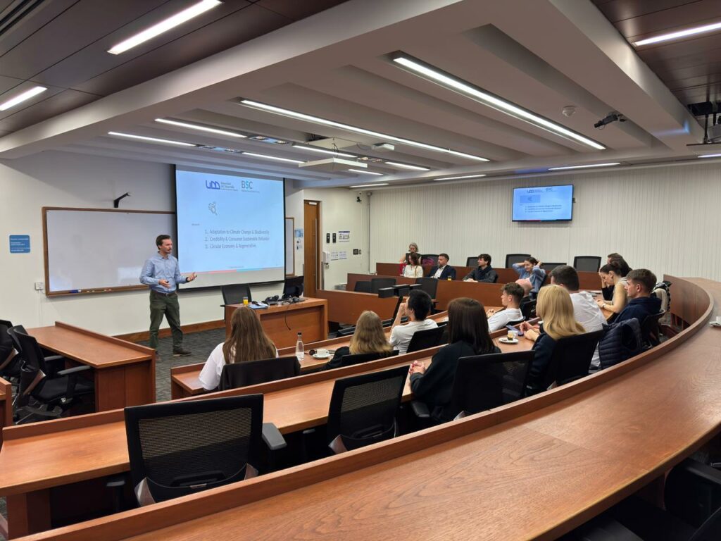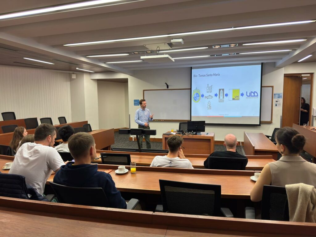 Durante la jornada, los estudiantes y profesores participaron en presentaciones a cargo de Tomás Santa María, investigador del BSC, quien profundizó en las líneas de investigación en sostenibilidad y en el proyecto de Upcycling que lidera; y de Sebastián Aguilar, subdirector de Ecosistema E+i y Desarrollo, quien expuso sobre el rol de la UDD dentro del ecosistema de innovación y emprendimiento en Chile y Latinoamérica.