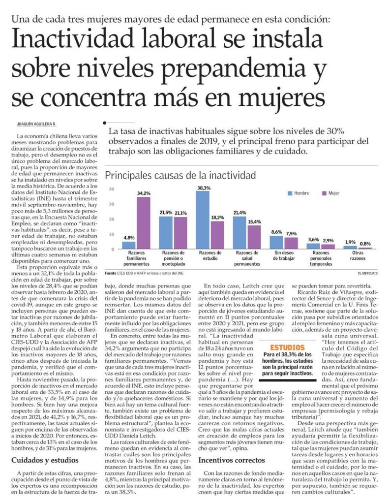 En concreto, entre todas las mujeres que se declaran inactivas, el 34,2% argumenta que no participa del mercado del trabajo por razones familiares permanentes. “Vemos que una de cada tres mujeres inactivas está en esa condición por razones familiares permanentes y, de acuerdo al INE, esto incluye personas que declaran razones de cuidado y/o quehaceres domésticos. Si bien acá hay un tema cultural fuerte, también existe un problema de flexibilidad laboral que es un problema estructural”, plantea la economista e investigadora del CIES-UDD Daniela Leitch.
