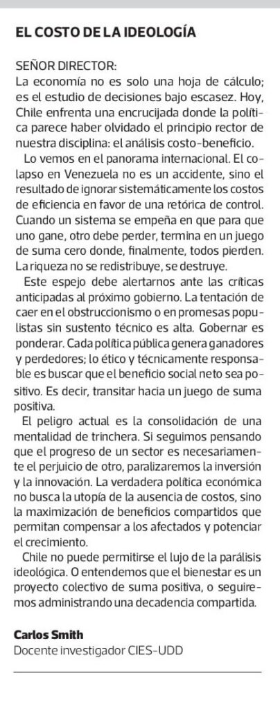 El peligro actual es la consolidación de una mentalidad de trinchera. Si seguimos pensando que el progreso de un sector es necesariamente el perjuicio de otro, paralizaremos la inversión y la innovación. La verdadera política económica no busca la utopía de la ausencia de costos, sino la maximización de beneficios compartidos que permitan compensar a los afectados y potenciar el crecimiento, Chile no puede permitirse el lujo de la parálisis ideológica. O entendemos que el bienestar es un proyecto colectivo de suma positiva, o seguiremos administrando una decadencia compartida.