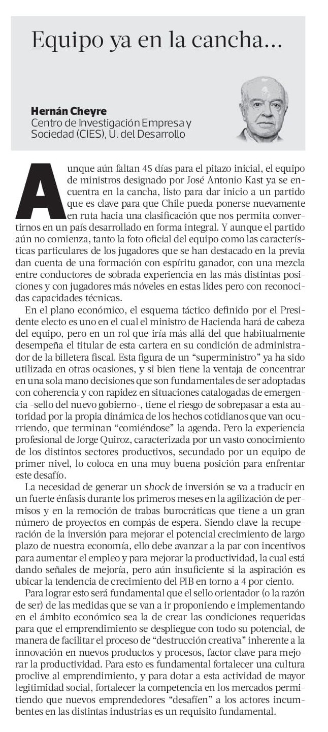 Aunque aún faltan 45 días para el pitazo inicial, el equipo de ministros designado por José Antonio Kast ya se encuentra en la cancha, listo para dar inicio a un partido que es clave para que Chile pueda ponerse nuevamente en ruta hacia una clasificación que nos permita convertirnos en un país desarrollado en forma integral. Y aunque el partido aún no comienza, tanto la foto oficial del equipo como las características particulares de los jugadores que se han destacado en la previa dan cuenta de una formación con espíritu ganador, con una mezcla entre conductores de sobrada experiencia en las más distintas posiciones y con jugadores más nóveles en estas lides pero con reconocidas capacidades técnicas.