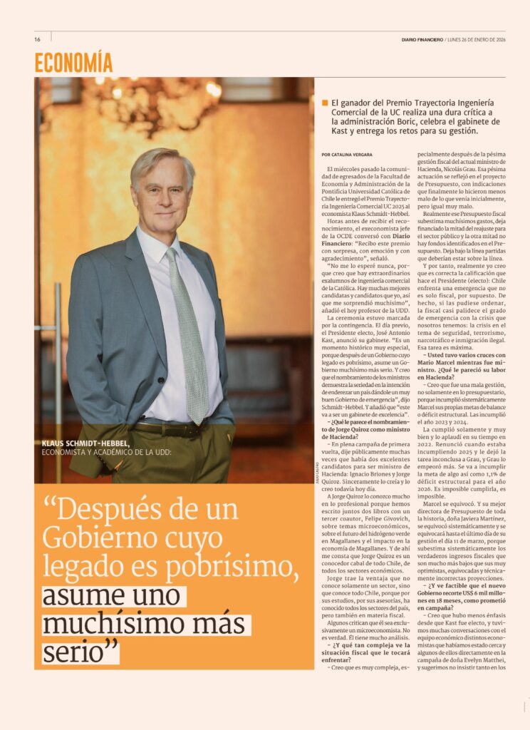 El miércoles pasado la comunidad de egresados de la Facultad de Economía y Administración de la Pontificia Universidad Católica de Chile le entregó el Premio Trayectoria Ingeniería Comercial UC 2025 al economista Klaus Schmidt-Hebbel.