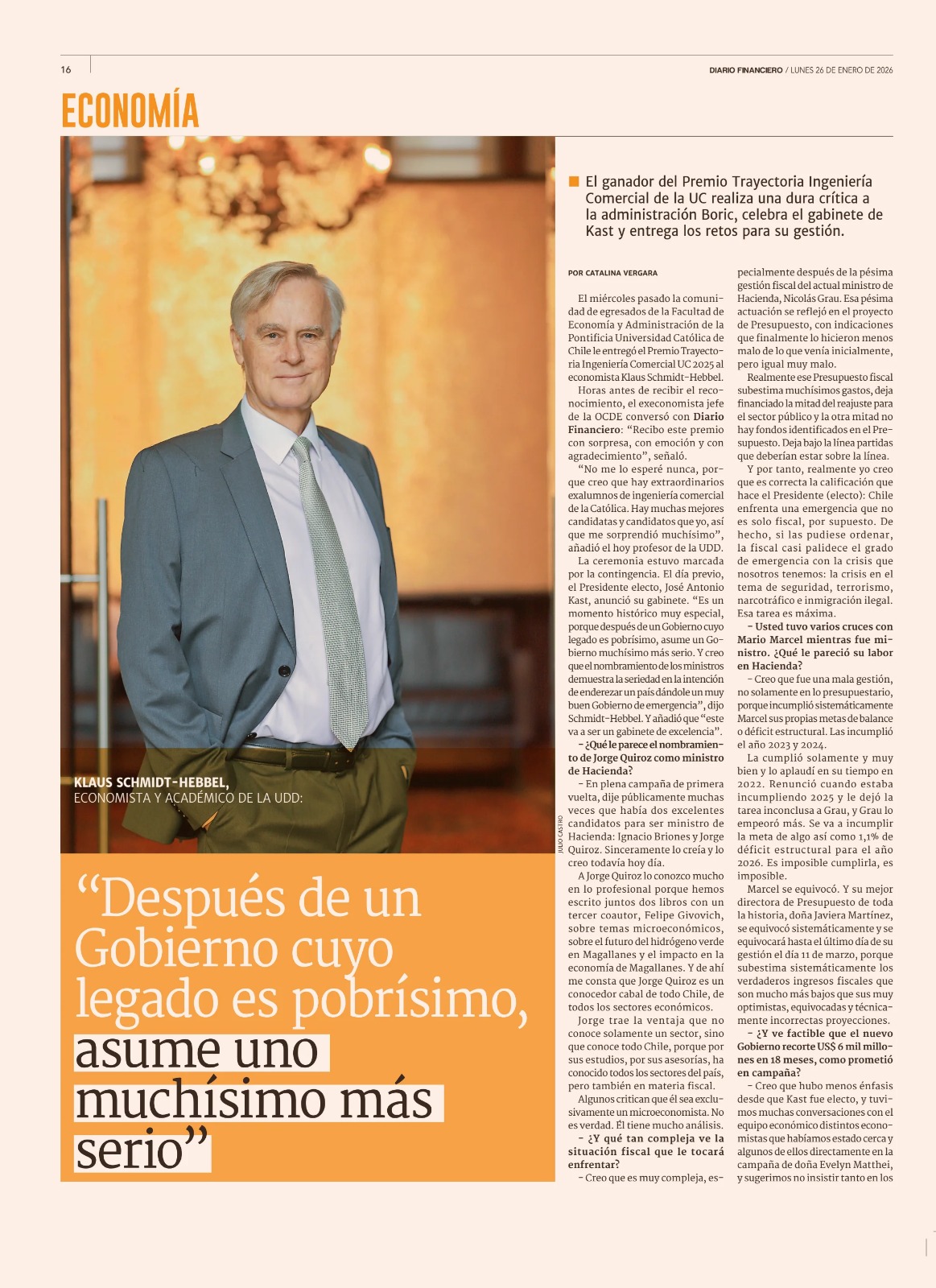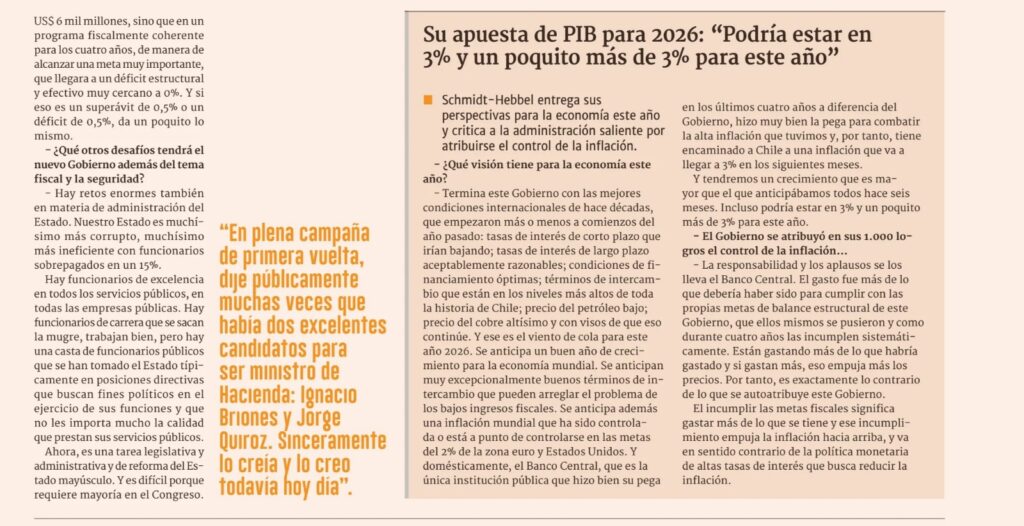 Klaus Schmidt-Hebbel entrega sus perspectivas para la economía este año y critica a la administración saliente por atribuirse el control de la inflación.