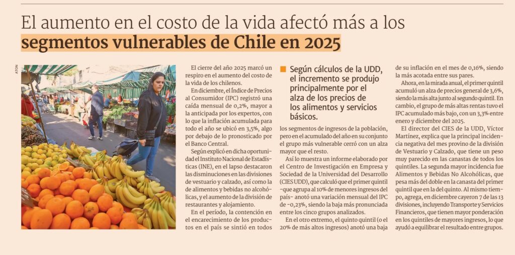 El director del CIES de la UDD, Víctor Martínez, explica que la principal incidencia negativa del mes provino de la división de Vestuario y Calzado, que tiene un peso muy parecido en las canastas de todos los quintiles. La segunda mayor incidencia fue Alimentos y Bebidas No Alcohólicas, que pesa más del doble en la canasta del primer quintil que en la del quinto.