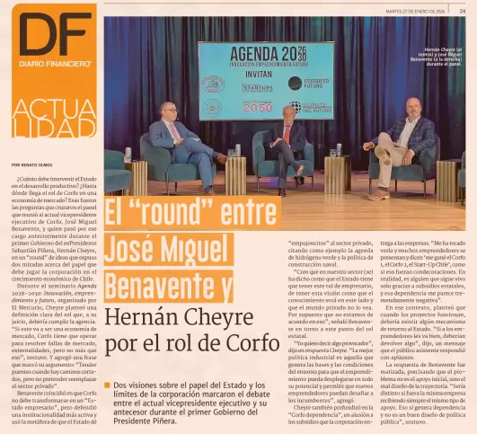 Un encuentro entre vicepresidentes ejecutivos de Corfo fue el que se dio durante la jornada, cuando Hernán Cheyre, quien ejerció el cargo entre 2010 y 2014, y José Miguel Benavente, actual vicepresidente ejecutivo de la corporación, se reunieron sobre el escenario para hablar sobre el rol de la estatal para el período 2026-2030.