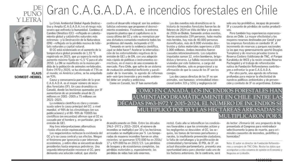 Pero también hay experiencias esperanzadoras en Chile. La mayor efectividad y los mayores recursos destinados por Conaf y por las empresas forestales en combatir IF, el incremento de reservas y parques nacionales (a las que muy generosamente aportó Douglas Tompkins) y de reservas privadas (como la Reserva Costera Valdiviana de TNC, el Parque Karukinka de WCS y la recién creada Reserva Puchegüín) y el trabajo de reforestación nativa de Fundación Reforestemos contribuyen a enfrentar la gran C.A.G.A.D.A.