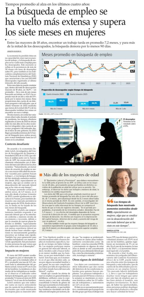 De acuerdo a la economista Daniela Leitch, investigadora del Centro de Investigación de Empresa y Sociedad (CIES) de la UDD, que elabora el análisis junto con la Asociación de AFP, las causas están estrechamente relacionadas con el deterioro del mercado laboral de los años recientes. “Naturalmente, un menor ritmo de creación de empleo se asocia a una mayor dificultad de encontrar vacantes para quienes buscan trabajar (…). Los tiempos de búsqueda han mostrado aumentos sostenidos desde 2022, especialmente en mujeres, algo que se condice con la desaceleración del mercado laboral que se ha visto en este tiempo”.