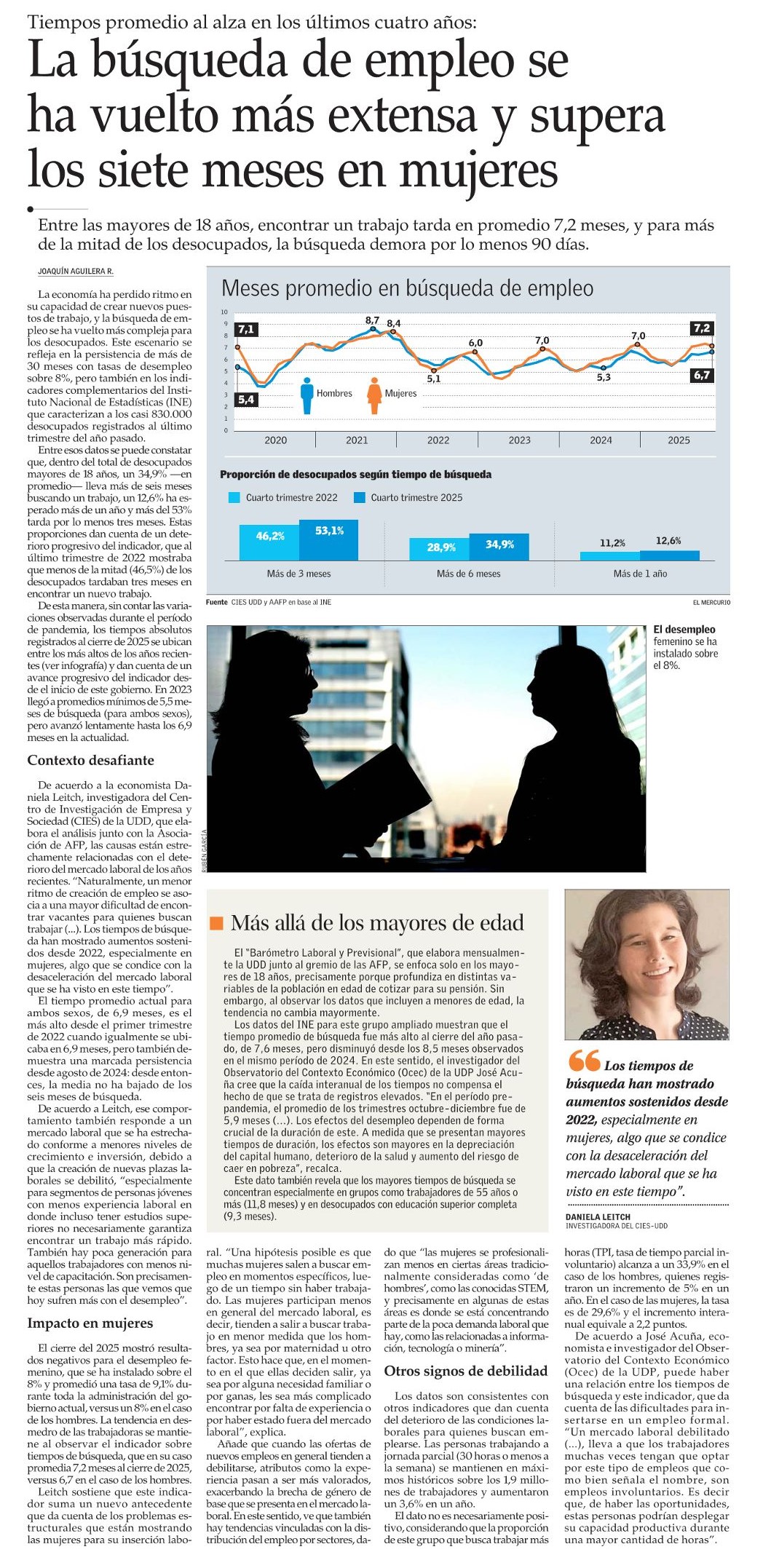 De esta manera, sin contar las variaciones observadas durante el período de pandemia, los tiempos absolutos registrados al cierre de 2025 se ubican entre los más altos de los años recientes (ver infografía) y dan cuenta de un avance progresivo del indicador desde el inicio de este gobierno. En 2023 llegó a promedios mínimos de 5,5 meses de búsqueda (para ambos sexos), pero avanzó lentamente hasta los 6,9 meses en la actualidad.