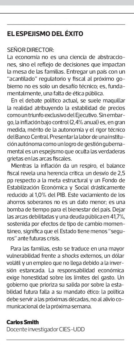 En el debate político actual, se suele maquillar la realidad atribuyendo la estabilidad de precios como un triunfo exclusivo del Ejecutivo. Sin embargo, la inflación bajo control (2,4% anual) es, en gran medida, mérito de la autonomía y el rigor técnico del Banco Central. Presentarla labor de una institución autónoma como un logro de gestión gubernamental es un espejismo que oculta las verdaderas grietas en las arcas fiscales.