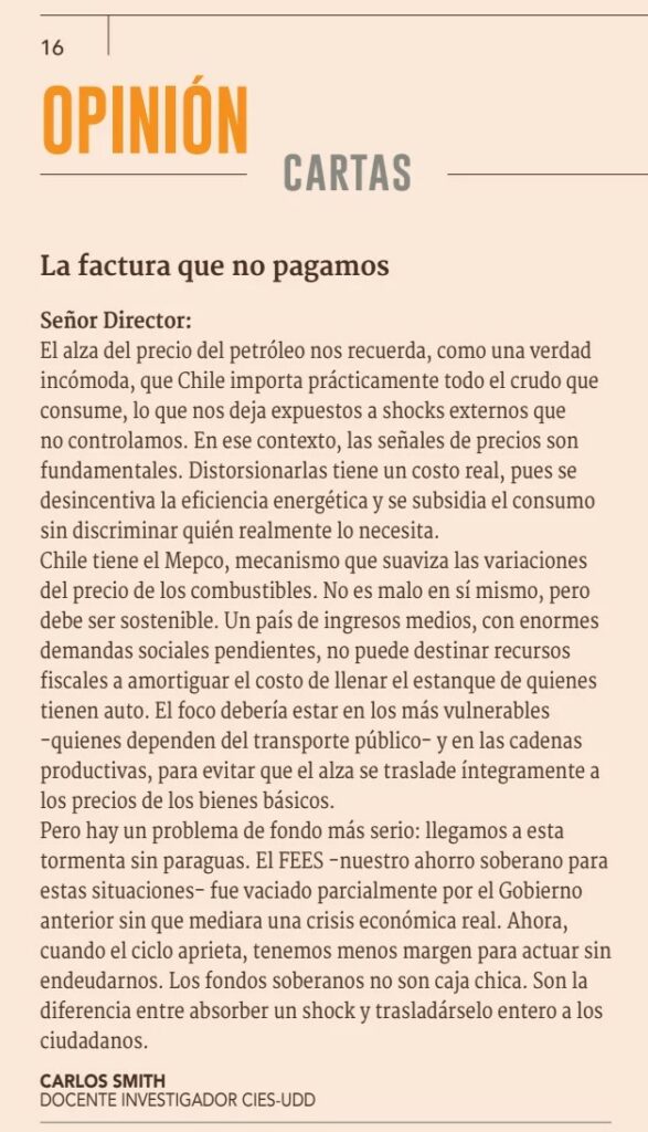 Chile tiene el Mepco, mecanismo que suaviza las variaciones del precio de los combustibles. No es malo en sí mismo, pero debe ser sostenible. Un país de ingresos medios, con enormes demandas sociales pendientes, no puede destinar recursos fiscales a amortiguar el costo de llenar el estanque de quienes tienen auto. El foco debería estar en los más vulnerables-quienes dependen del transporte público y en las cadenas productivas, para evitar que el alza se traslade íntegramente a los precios de los bienes básicos.