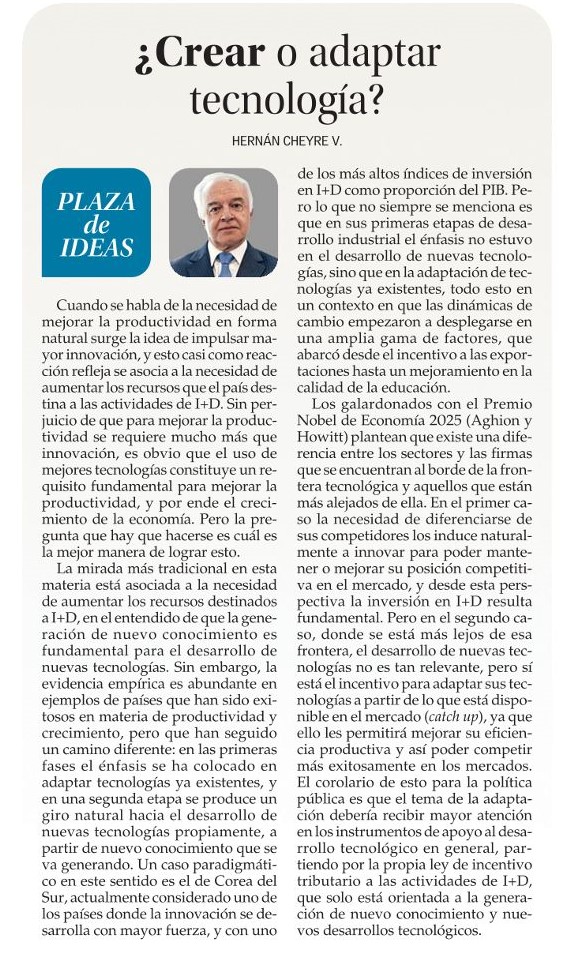 Cuando se habla de la necesidad de mejorar la productividad en forma natural surge la idea de impulsar mayor innovación, y esto casi como reacción refleja se asocia a la necesidad de aumentar los recursos que el país destina a las actividades de I+D. Sin perjuicio de que para mejorar la productividad se requiere mucho más que innovación, es obvio que el uso de mejores tecnologías constituye un requisito fundamental para mejorar la productividad, y por ende el crecimiento de la economía. Pero la pregunta que hay que hacerse es cuál es la mejor manera de lograr esto.