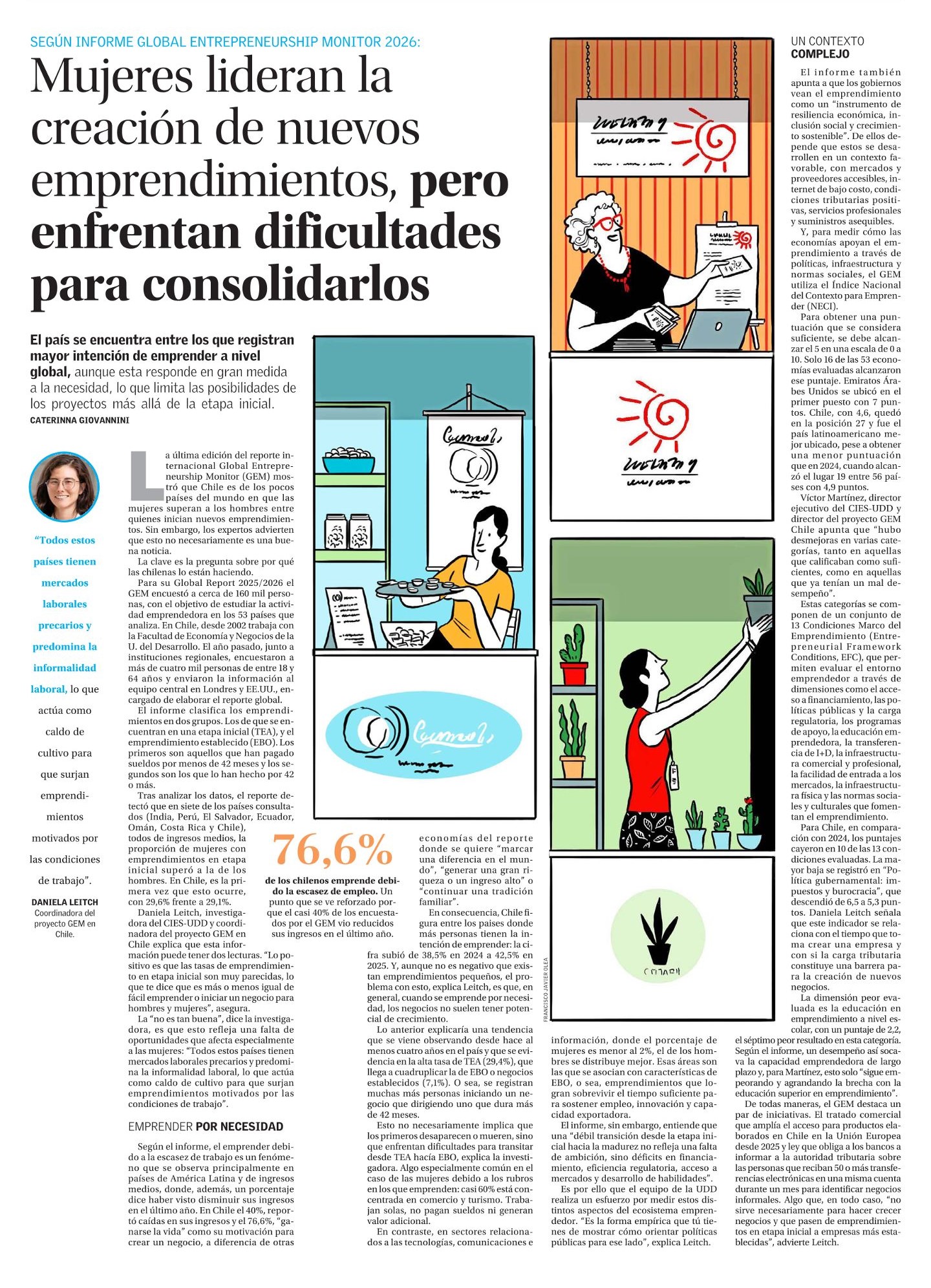 La clave es la pregunta sobre por qué las chilenas lo están haciendo. Para su Global Report 2025/2026, el GEM encuestó a cerca de 160 mil personas, con el objetivo de estudiar la actividad emprendedora en los 53 países que analiza. En Chile, desde 2002 trabaja con la Facultad de Economía y Negocios de la Universidad del Desarrollo. El año pasado, junto a instituciones regionales, encuestaron a más de cuatro mil personas de entre 18 y 64 años y enviaron la información al equipo central en Londres y EE.UU., encargado de elaborar el reporte global.