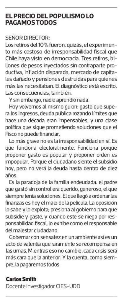 Los retiros del 10% fueron, quizás, el experimento más costoso de irresponsabilidad fiscal que Chile haya visto en democracia. Tres retiros, billones de pesos inyectados sin contraparte productiva, inflación disparada, mercado de capitales dañado y pensiones destruidas para quienes más las necesitaban. El diagnóstico está escrito. Las consecuencias, también.