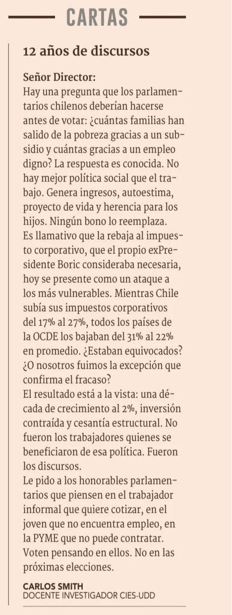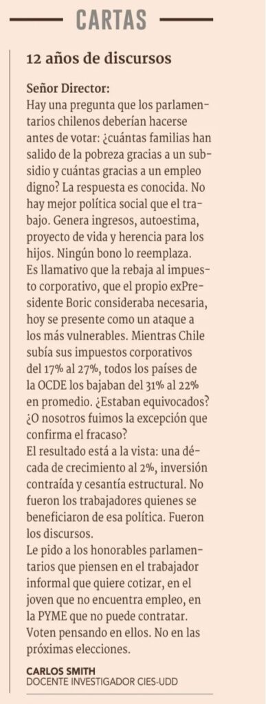 Es llamativo que la rebaja al impuesto corporativo, que el propio ex Presidente Boric consideraba necesaria, hoy se presente como un ataque a los más vulnerables. Mientras Chile subía sus impuestos corporativos del 17% al 27%, todos los países de la OCDE los bajaban del 31% al 22% en promedio. ¿Estaban equivocados? ¿O nosotros fuimos la excepción que confirma el fracaso? El resultado está a la vista: una década de crecimiento al 2%, inversión contraída y cesantía estructural. No fueron los trabajadores quienes se beneficiaron de esa política. Fueron los discursos.