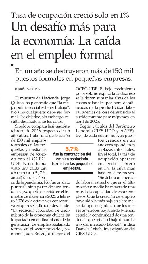 Si solo se compara la situación a febrero de 2026 respecto de un año atrás, hubo una destrucción de 150 mil empleos formales en las pequeñas y medianas empresas, de acuerdo con el OCEC-UDP. No se había visto una caída tan abrupta (5,7% anual) desde la época de la pandemia. No fue un dato puntual, sino parte de una tendencia, ya que lo ocurrido en el trimestre de diciembre 2025 a febrero 2026 es la octava vez consecutiva en que ese indicador desciende. “La reducida capacidad de crecimiento de la economía chilena ha impactado en el dinamismo de la generación de empleo asalariado formal en el sector privado”, comenta Juan Bravo, director del OCEC-UDP. El bajo crecimiento por sí solo no explica la caída, a eso se le deben sumar las alzas de los costos salariales por hora desalineadas de la productividad laboral, además del cese del subsidio al sueldo mínimo para mipymes, en abril de 2025.